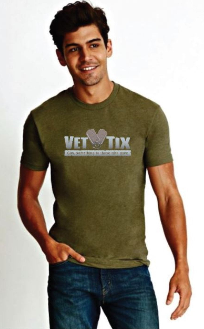 Short Sleeve, Vet Tix logo on front. 60% Combed Ring-Spun Cotton 40% Polyester