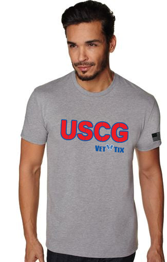 Short Sleeves, USCG logo on front (Large) with Vet Tix logo on front (Small), and single color U.S. Flag screen print on left sleeve.