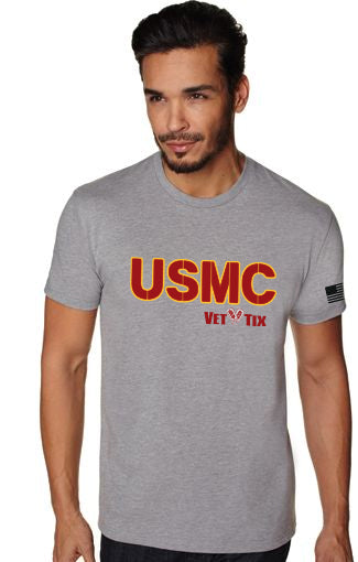 Short Sleeves, USMC logo on front (Large) with Vet Tix logo on front (Small), and single color U.S. Flag screen print on left sleeve.
